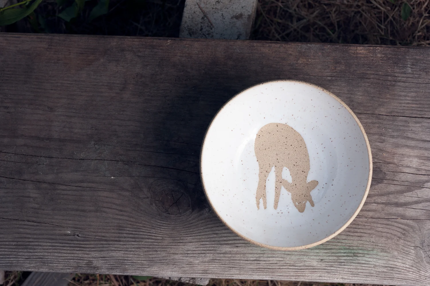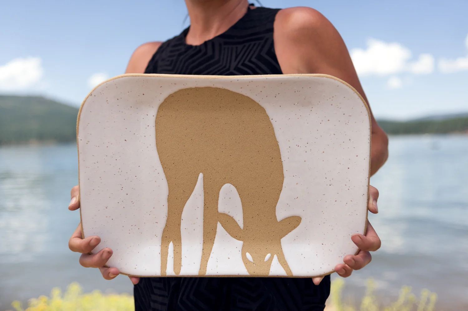 For our platters and bowls the silhouette is created by painting wax resist onto the dish; then glazing around the deer. We like the contrast this creates both visually and texturally between the speckled calico clay body and the white glaze.